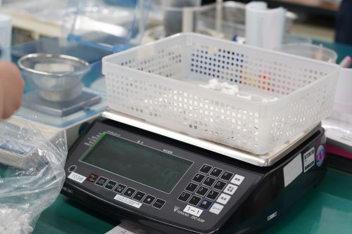 ②規定の重量値範囲内であることを計量機で測定し、確認します。