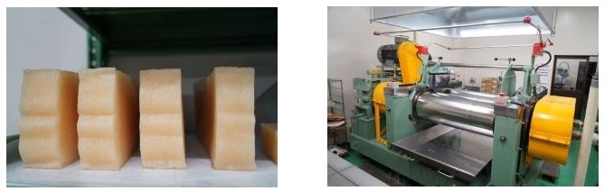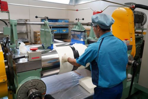 ③所定の厚み、長さ、幅の配合ゴムシートを製造します。